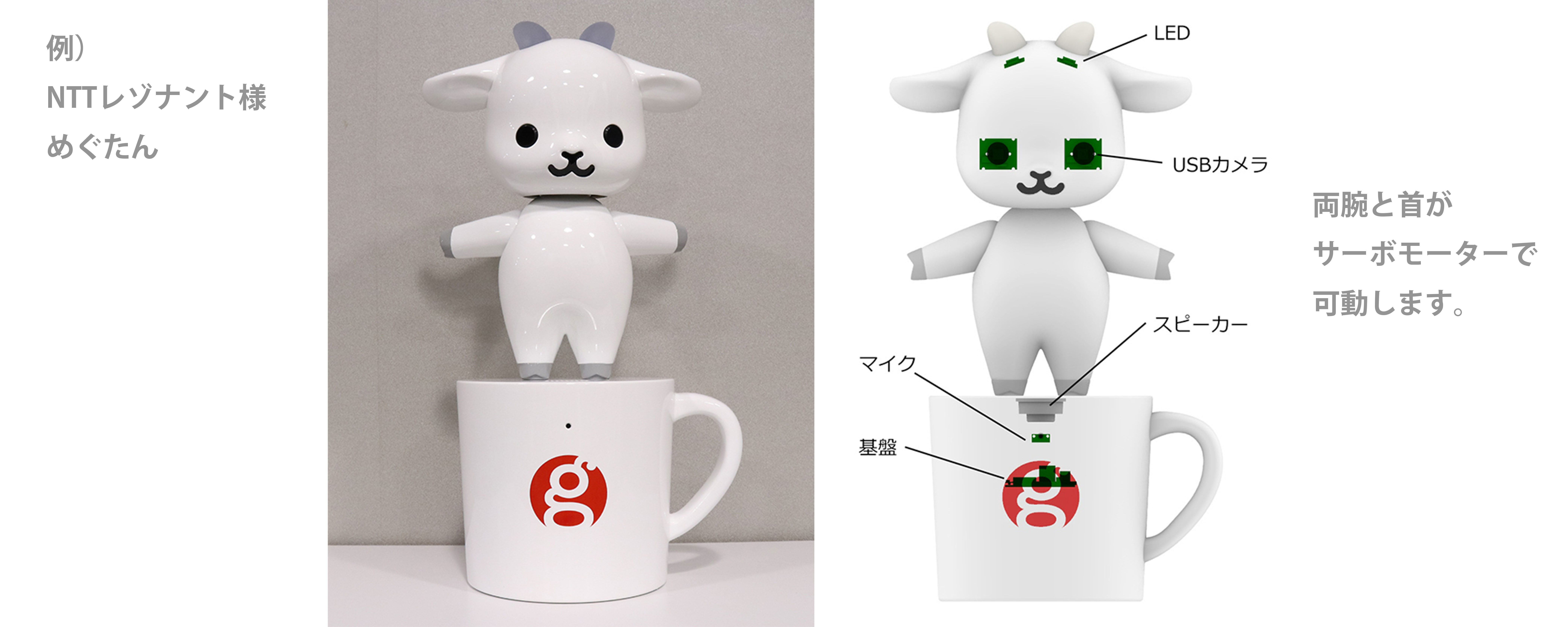 オーダーメイドロボット製作サービス「3D ROBOT」では、貴社のオリジナルの形状をデザインし、モーターやLED、カメラ、スピーカー、マイク等さまざまなパーツを組み合わせてロボットを製作することが可能です。ここではその構成要素を説明します。